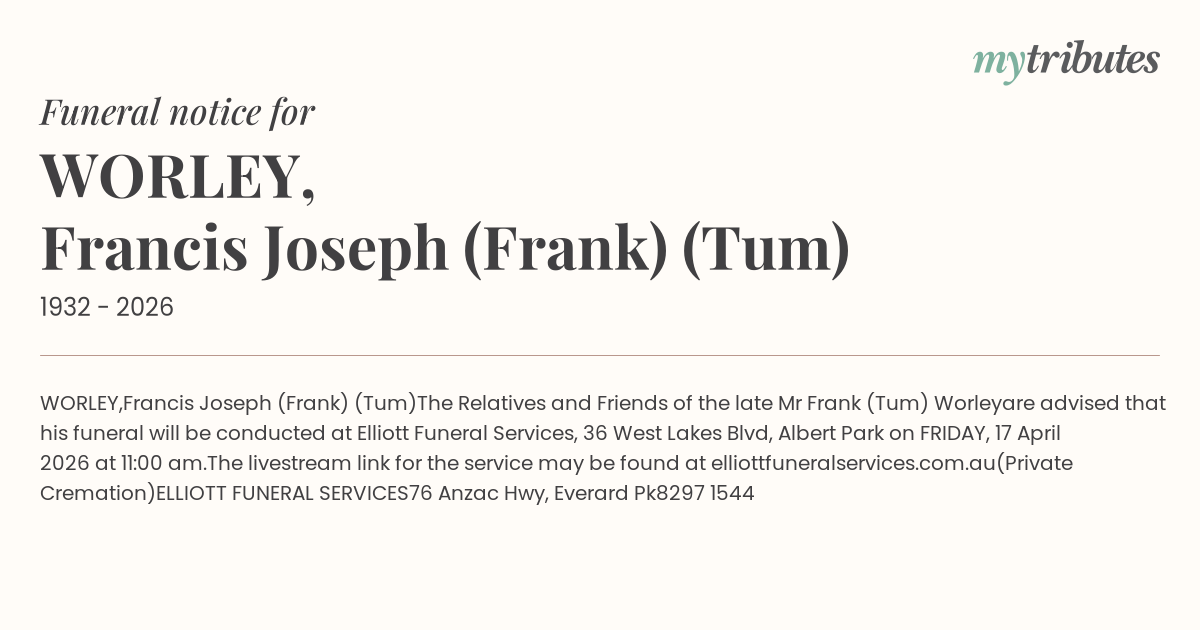 The livestream link for the service may be found at elliottfuneralservices.com.au
