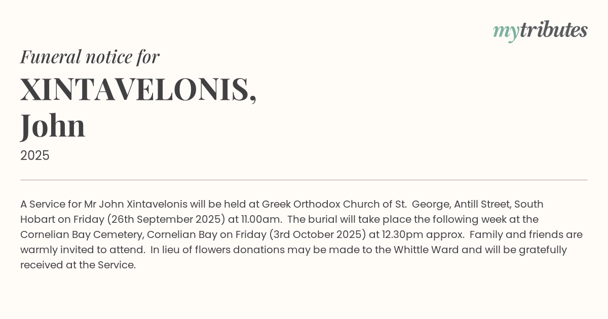 19°CA Service for Mr John Xintavelonis will be held at Greek Orthodox Church of St. George, Antill Street, South Hobart on Friday (26th September 2025) at 11.00am. The burial will take place the following week at the Cornelian Bay Cemetery, Cornelian Bay on Friday (3rd October 2025) at 12.30pm approx. Family and friends are warmly invited to attend. In lieu of flowers donations may be made to the Whittle Ward and will be gratefully received at the Service.