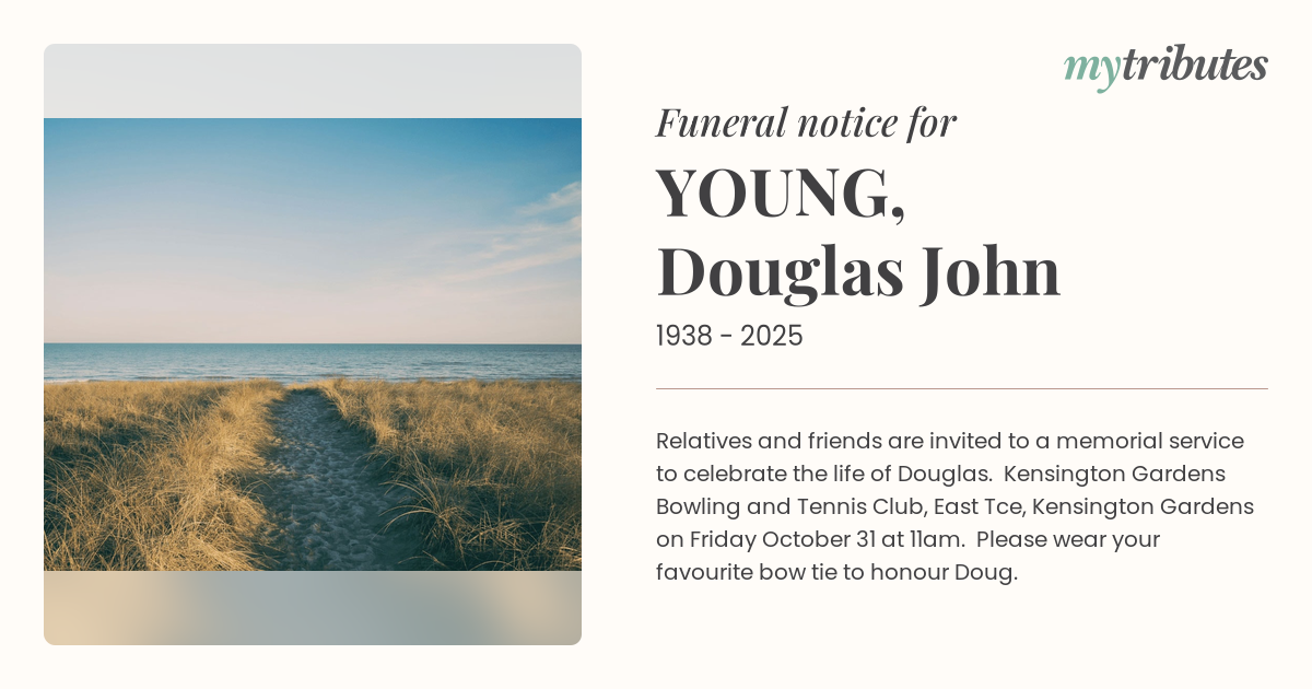 19°CRelatives and friends are invited to a memorial service to celebrate the life of Douglas. Kensington Gardens Bowling and Tennis Club, East Tce, Kensington Gardens on Friday October 31 at 11am. Please wear your favourite bow tie to honour Doug.