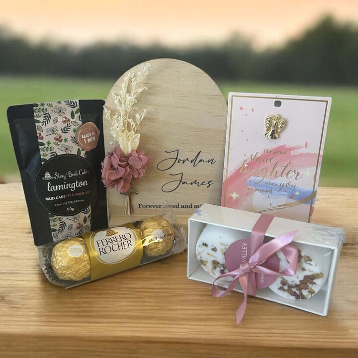 In moments of unimaginable loss, finding the right words can feel impossible. This Pregnancy & Infant Loss Gift Hamper has been thoughtfully curated to offer quiet comfort, compassion, and a gentle reminder that love always remains. Each item has been chosen with care to honour a precious life gone too soon while supporting moments of reflection, self-care, and remembrance. Beautifully presented, this hamper is a heartfelt way to show empathy, hold space for grief, and let someone know they are not alone during an incredibly tender time. Whether given as a sympathy gift or sent as a loving gesture of support, this keepsake-filled hamper offers warmth, meaning, and a sense of peace when it is needed most. ⭐ Product Features Thoughtfully curated pregnancy & infant loss sympathy hamper Includes 5 meaningful keepsake and comfort items Beautifully presented and ready to gift Designed to offer remembrance, self-care, and emotional support Suitable for miscarriage, stillbirth, or infant loss Hamper Includes Preserved Flower Name Arch with stand Australian-made aromatherapy shower steamers (2 pack) Gold-colour angel pin keepsake Mini cherub angel figurine Ferrero Rocher chocolates (3 pack) 💛 Why It’s SpecialThis hamper is more than a gift—it’s a quiet embrace. Each piece has been chosen to acknowledge loss with tenderness, offering comfort without expectation and honouring a love that will always exist, no matter how brief the time.